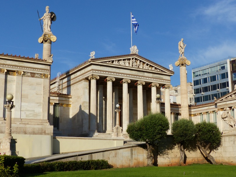 Next, we will see the National Library of Greece, an impressive Doric-style building designed by Danish architect Theophilus Hansen. It is part of the famous Athenian Trilogy of neoclassical buildings. In the National Library, there are lush gardens and sculptures of great Greek artists, as well as statues of the Vallianos brothers.